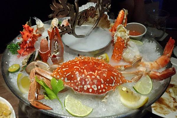 說是一至二人份,但可能我們點太多東西,吃到後來我們都吃不下了,然後他有三種沾醬:辣根、雞尾酒、泰式香菜,但老實說我吃到最後,最想沾的是白醋薑末(台客魂),總之這是一道很華麗虛榮又強身健體的海鮮塔。